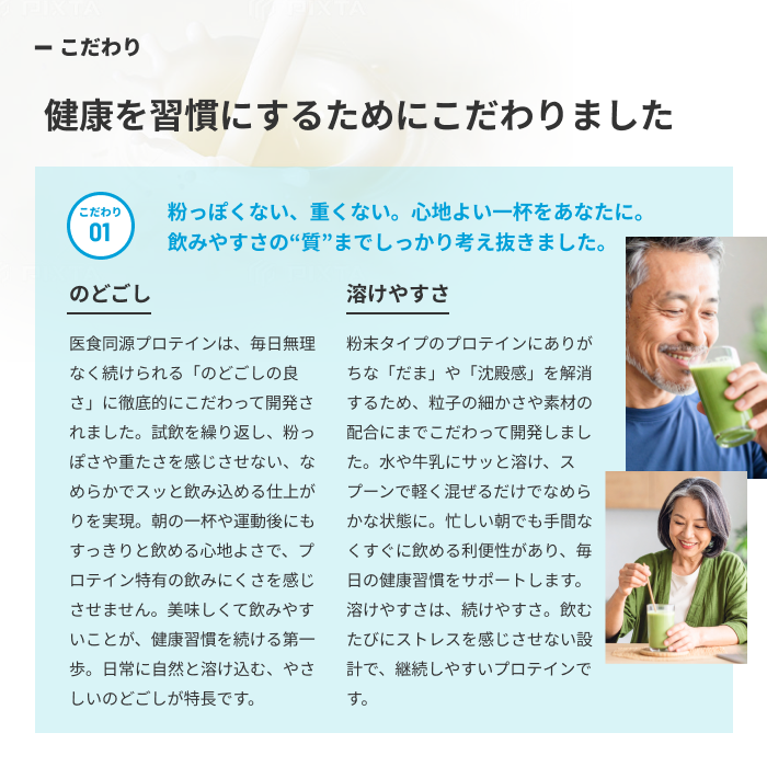 健康を支えるためには、続けやすさが何より大切です。医食同源プロテインは、飲みやすさにこだわり、毎日飲みたくなる自然な味わいを追求しました。美味しいから続けられ、続けられるからこそ効果が実感できます。体に必要な栄養をしっかり補い、健康的な毎日を支えるサポート役として設計されています。