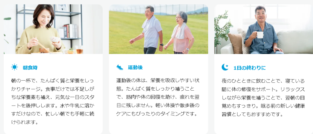 その他、決まった時間にとらわれず、ご自身の生活リズムに合わせてお飲みいただけるのも、このプロテインの魅力です。食事が軽くなりがちな日や、間食の代わりとして、また食欲のないときの栄養補給にもぴったり。水や牛乳などにさっと溶けるので、外出先や仕事の合間にも手軽に取り入れられます。